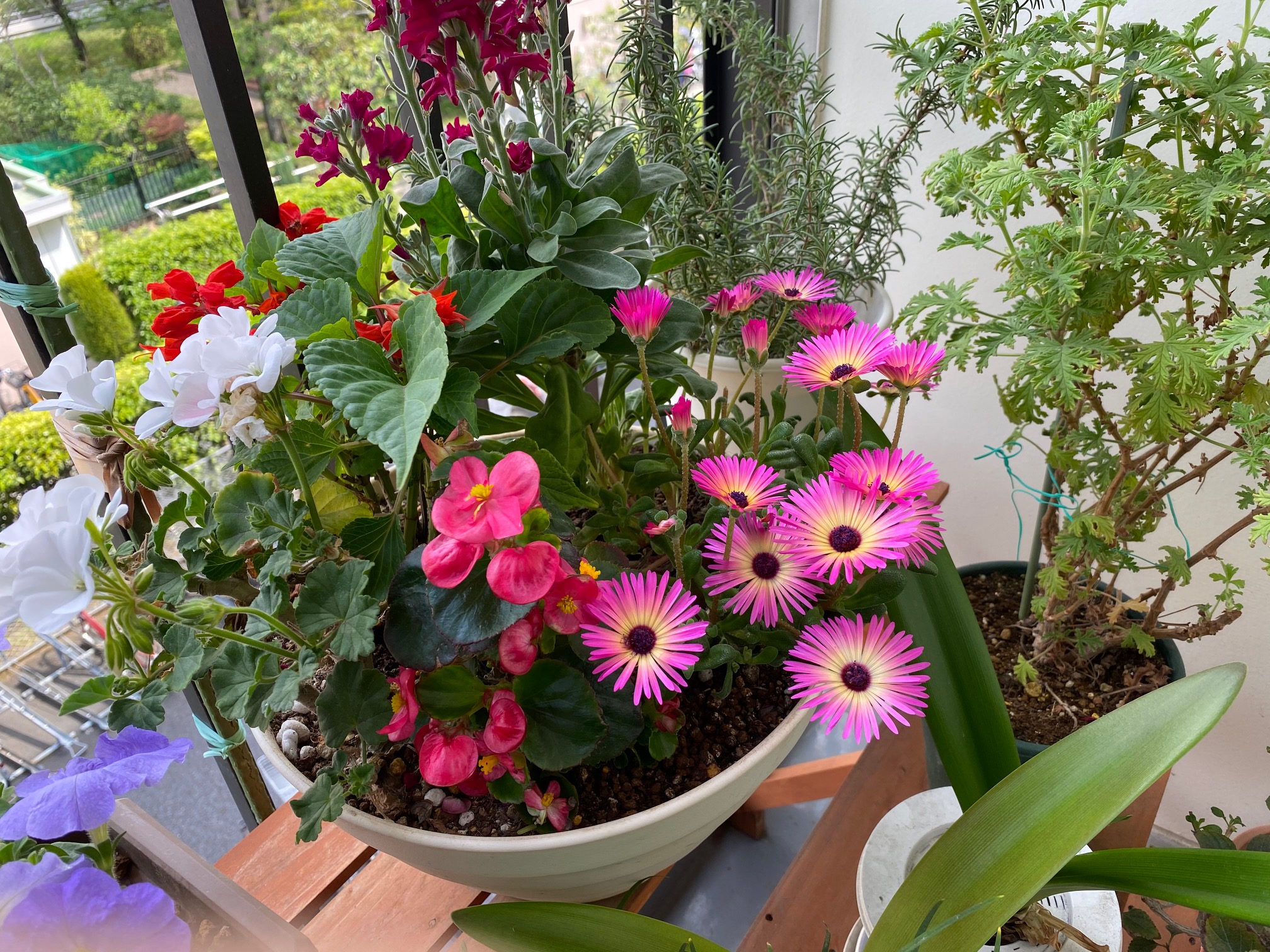 園芸仲間、丹川さんのベランダガーデンを拝見。寄せ植えの 鉢を楽しく飾って、一年じゅう楽しんでいます。土いじりに 癒され、花から元気をもらって、はつらつと暮らしています。