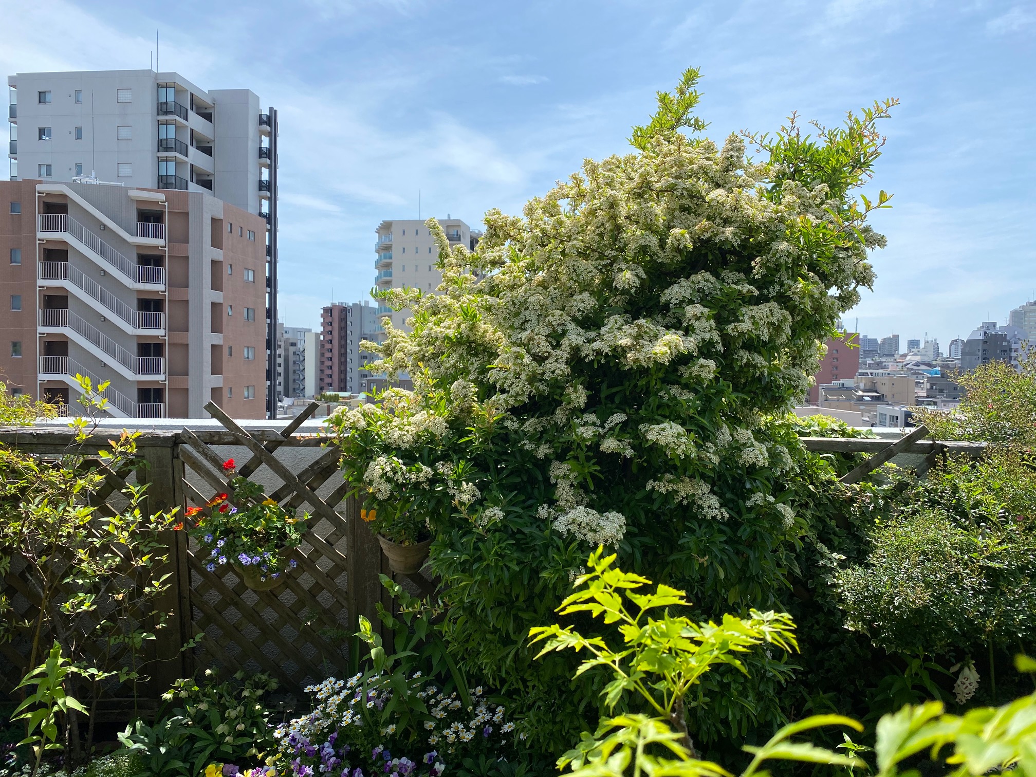 シンボルツリーのピラカンサ(トキワサンザシ)が 白い花をたわわにつけ、まるで雪をかぶっているようです。 テイカカズラも満開。こんもりとしてきました